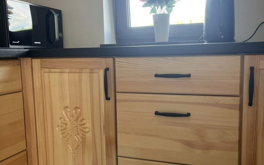 Zobacz drewniane meble z naturalnego drewna, z charakterystycznymi góralskimi rzeźbieniami.